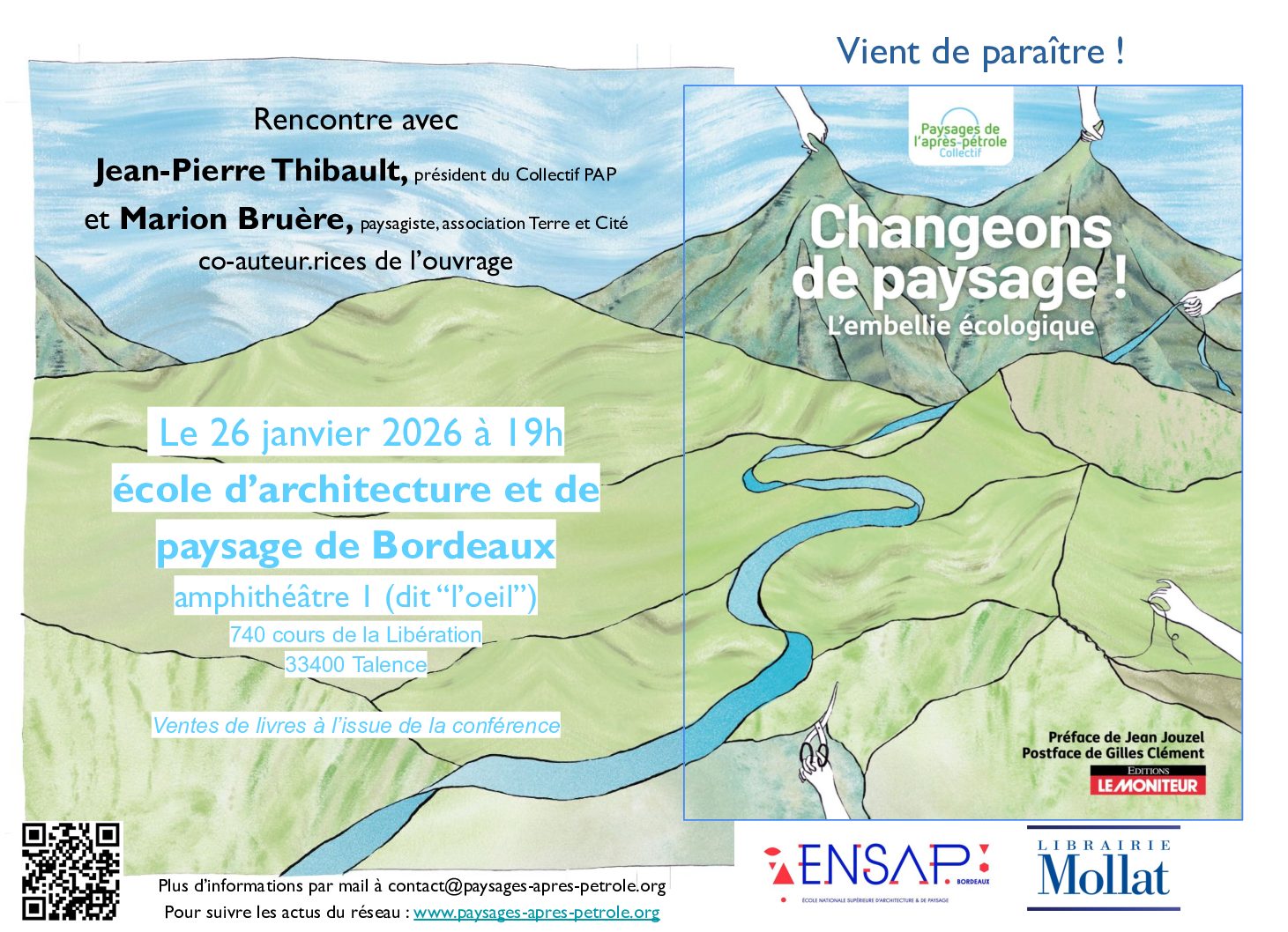 Le lundi 26 janvier à 19h à l’Ecole Nationale Supérieure d’Architecture et de Paysage de Bordeaux (amphi 1), présentation publique du dernier livre du Collectif Paysages de l’Après-Pétrole : « Changeons de paysage !, l’embellie écologique » par deux de ses co-auteurs. Cette présentation sera suivie d’un débat, puis d’une vente-dédicace des livres en coopération avec la Librairie Mollat, enfin d’un vin d’honneur offert par l’Ecole.